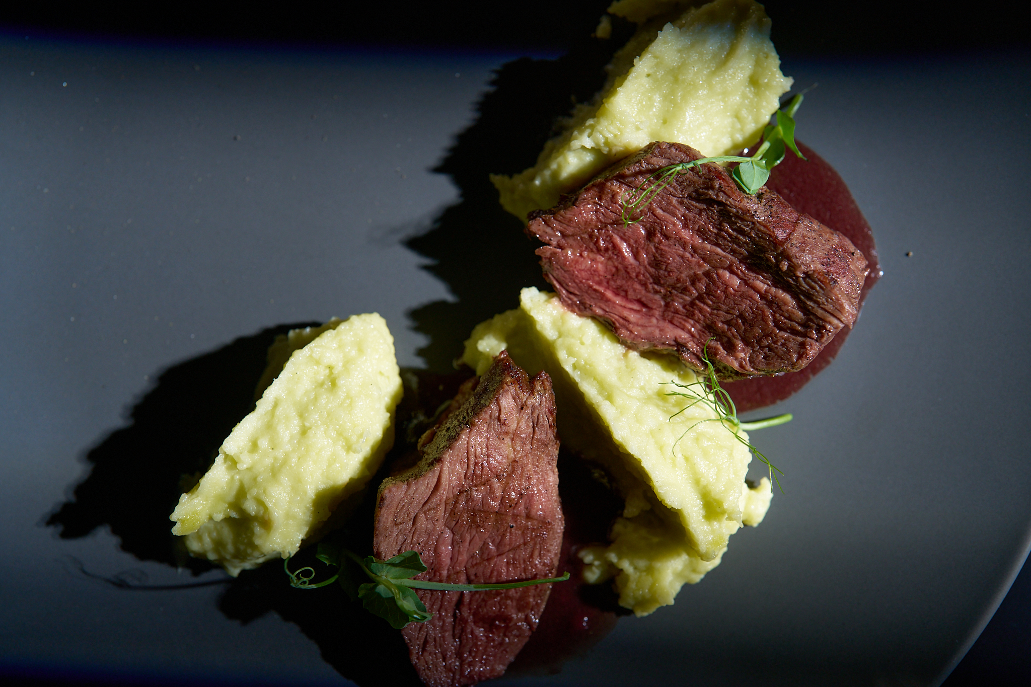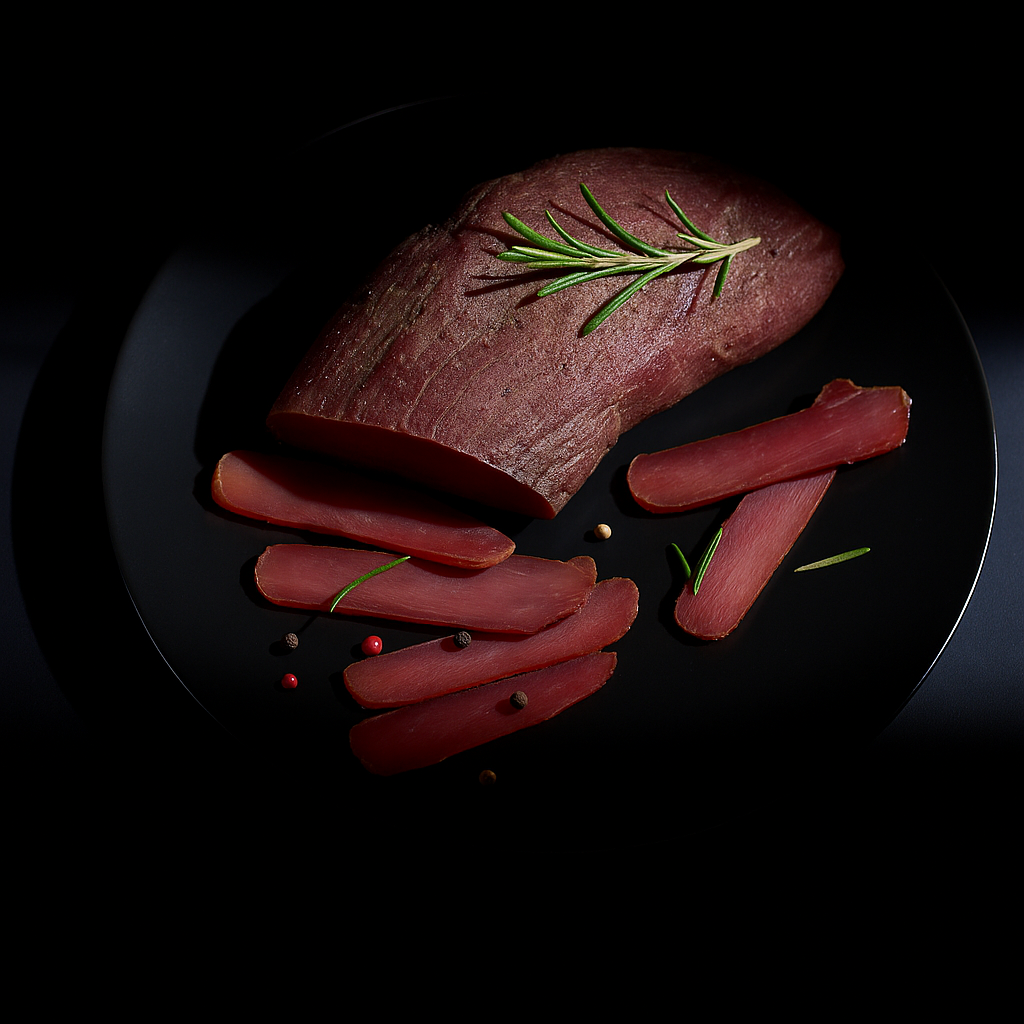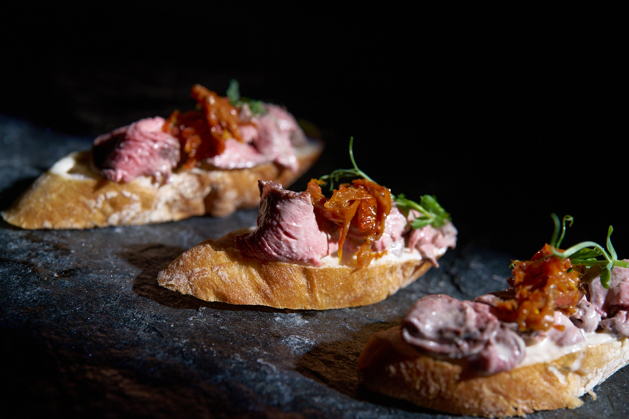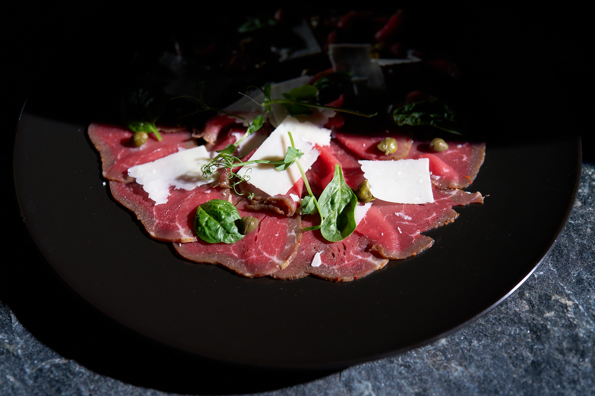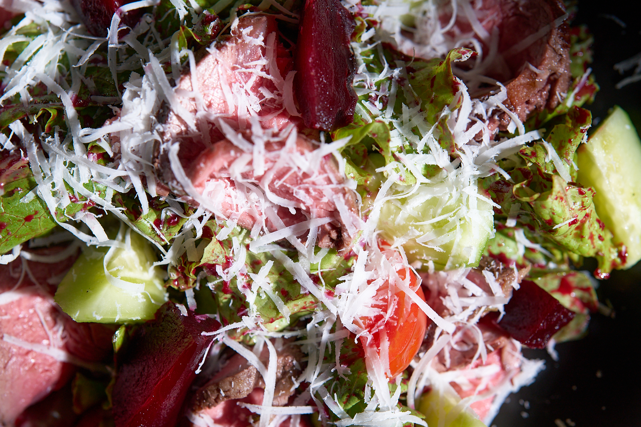 тънко нарязан ростбиф, свежа зелена салата, хрупка краставица, чери домати, печено червено цвекло, с финален акцент с дресинг от вишня и поръска пармезан на люспи