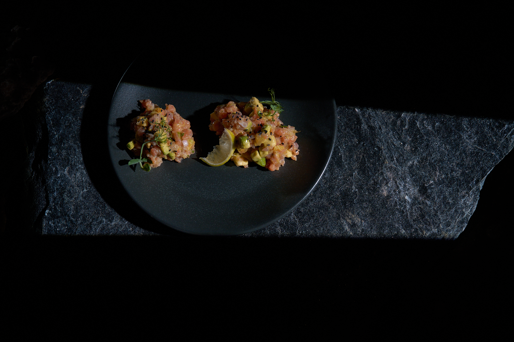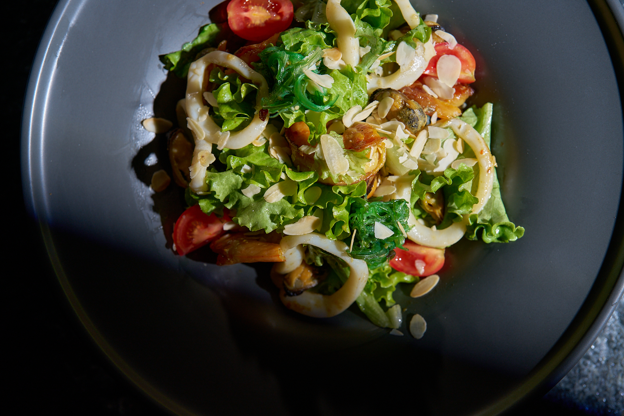 комбинация от скариди, калмари и миди, съчетани със свежи зелени салати, чери домати и лек цитрусов дресинг