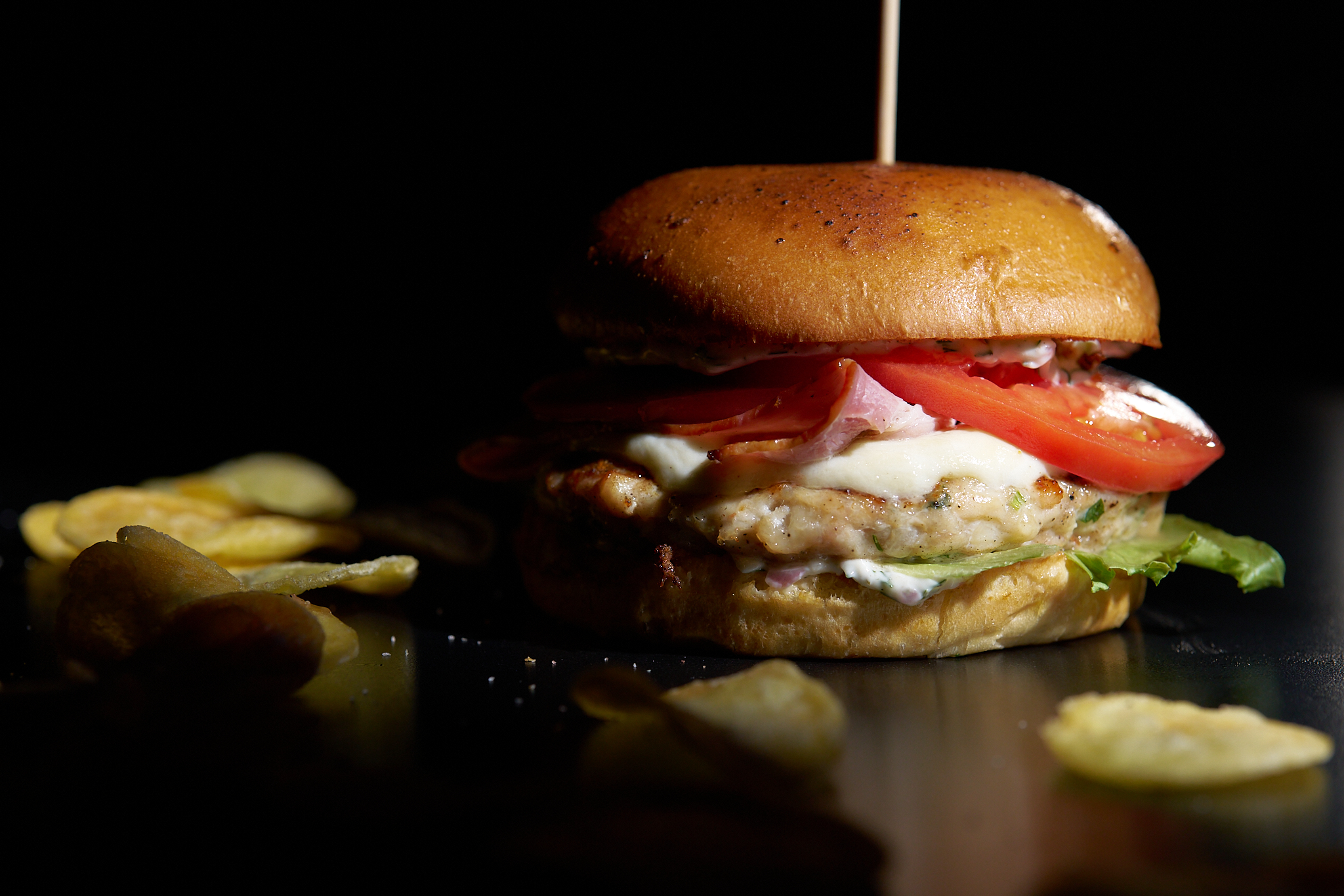 Пилешки Бургер на грил с бекон – гарниран с домат, краставица, айсберг, хрупкав лук и разтапяша се сирене чедър. Всичко обединено от специален сос в пухкаво млечно хлебче и хрупкав картофен чипс